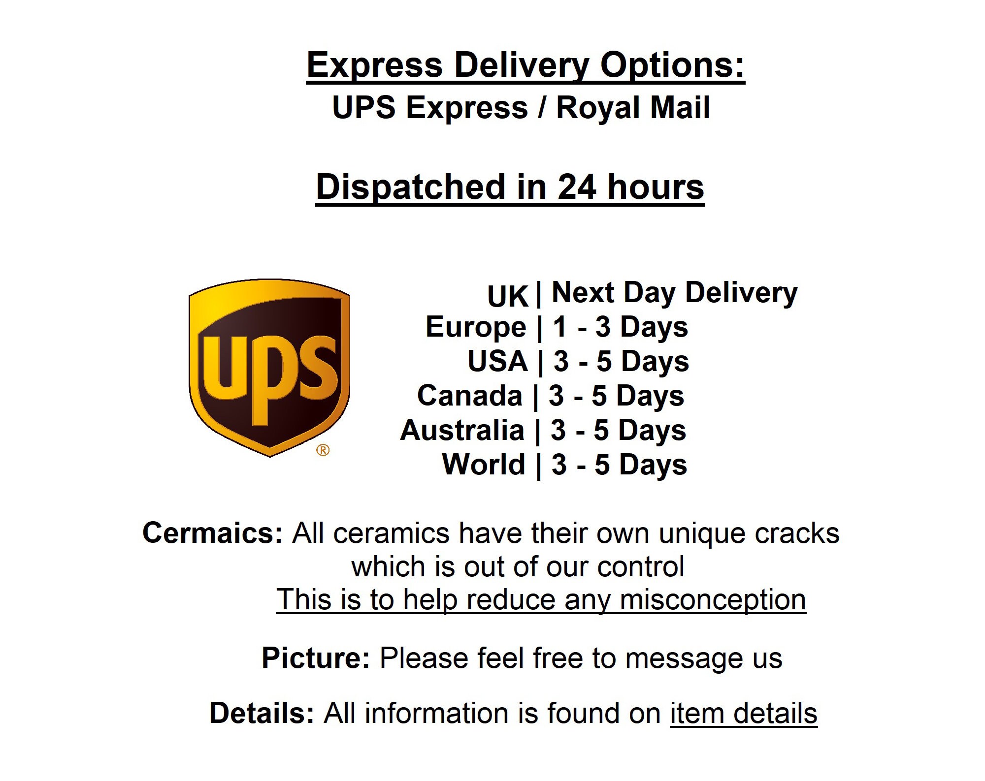 Serviced by UPS parcel delivery within 1 working day throughout most of UKs mainland. Shipping has never been easier. Next day delivery and free returns to store.